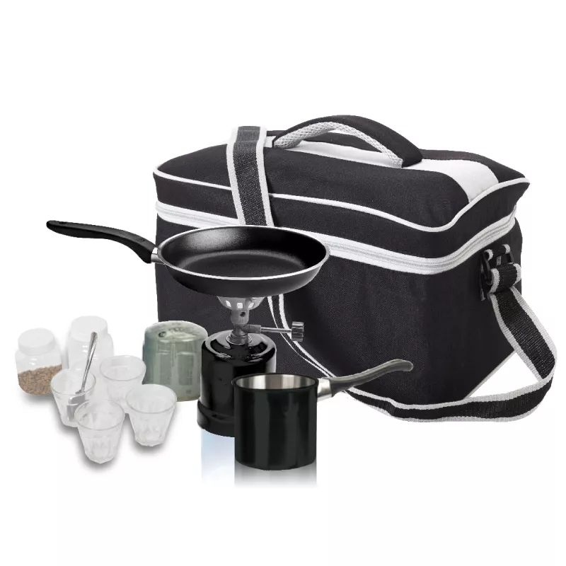 ערכת קפה המכילה גזיה איכותית באישור מכון התקנים 2 מיכלים לתה / קפה / סוכר, פינג’אן מחבת, 4 כוסות זכוכית תיק נשיאה עם מחיצות פנימיות ידית נשיאה מרופדת ורצועת נשיאה (מגיע ללא מיכל גז) 26X22X35 ס”מ