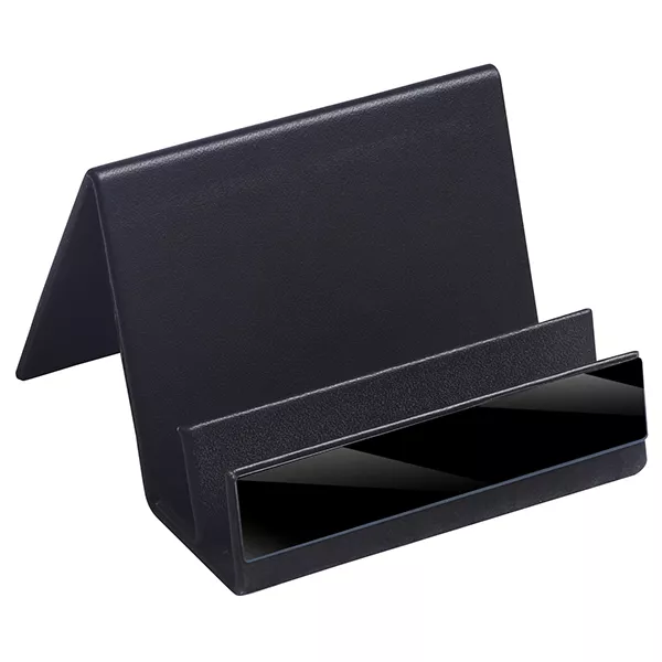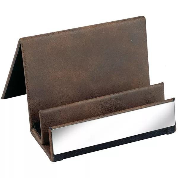 מעמד שולחני בשילוב דמוי עור ונירוסטה עם מקום לטלפון וכרטיסי ביקור. צבעים: שחור / חום.