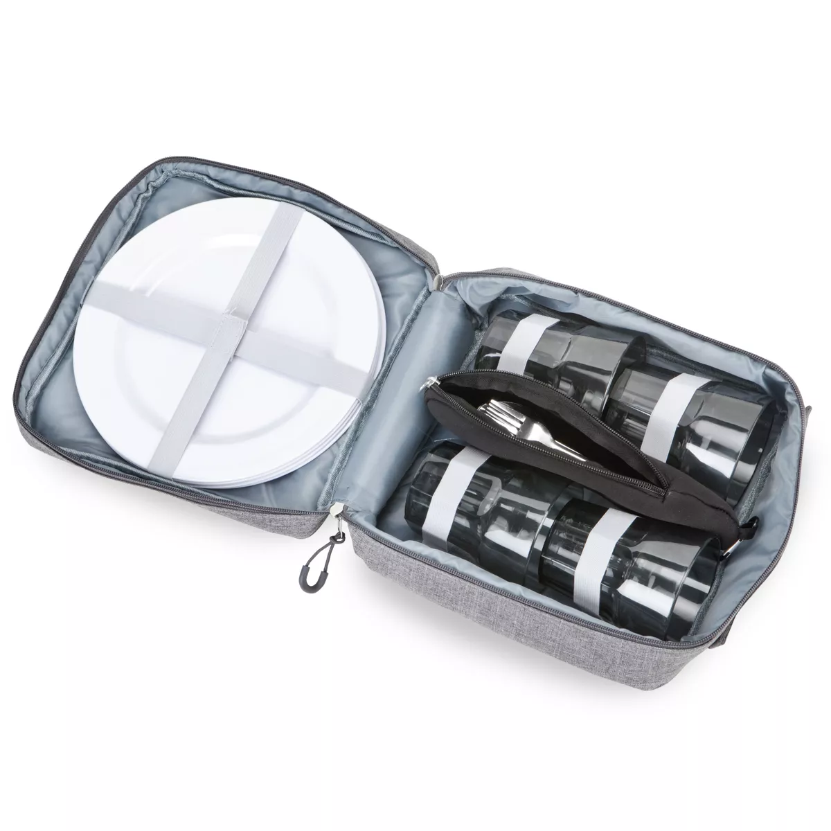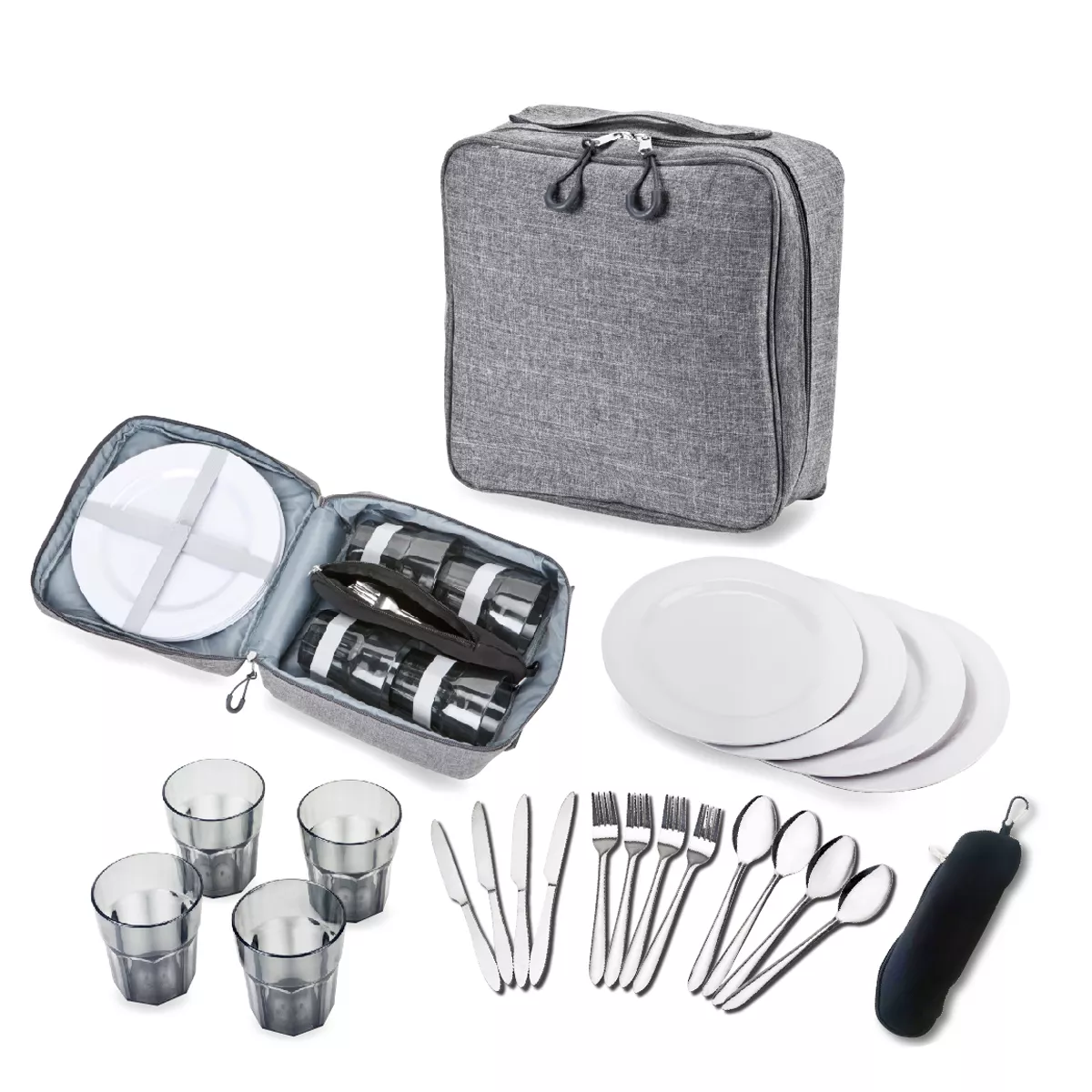 סט נוח לנשיאה עבור 4 סועדים 4 * צלחת מלמין, כוס שתיה, סכו”ם נירוסטה תיק נשיאה פנימי לסכו”ם עם תופסן מתכת. כל הכלים ניתנים לניקוי במדיח כלים. אסור להכניס חלקי פלסטיק ומתכת למיקרו. מידות התיק: 10*24*24 ס”מ צבעים : כחול / טורקיז / אפור